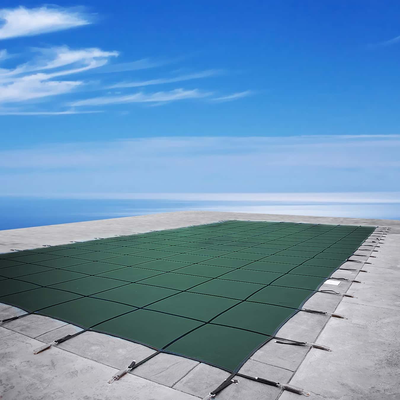 - Полипропиленовые ремни из ПВХ, анкерные крепления и стальные фиксаторы обеспечивают плотное прилегание накрытия к кромке бассейна и предотвращают трение, продлевая срок его службы.
