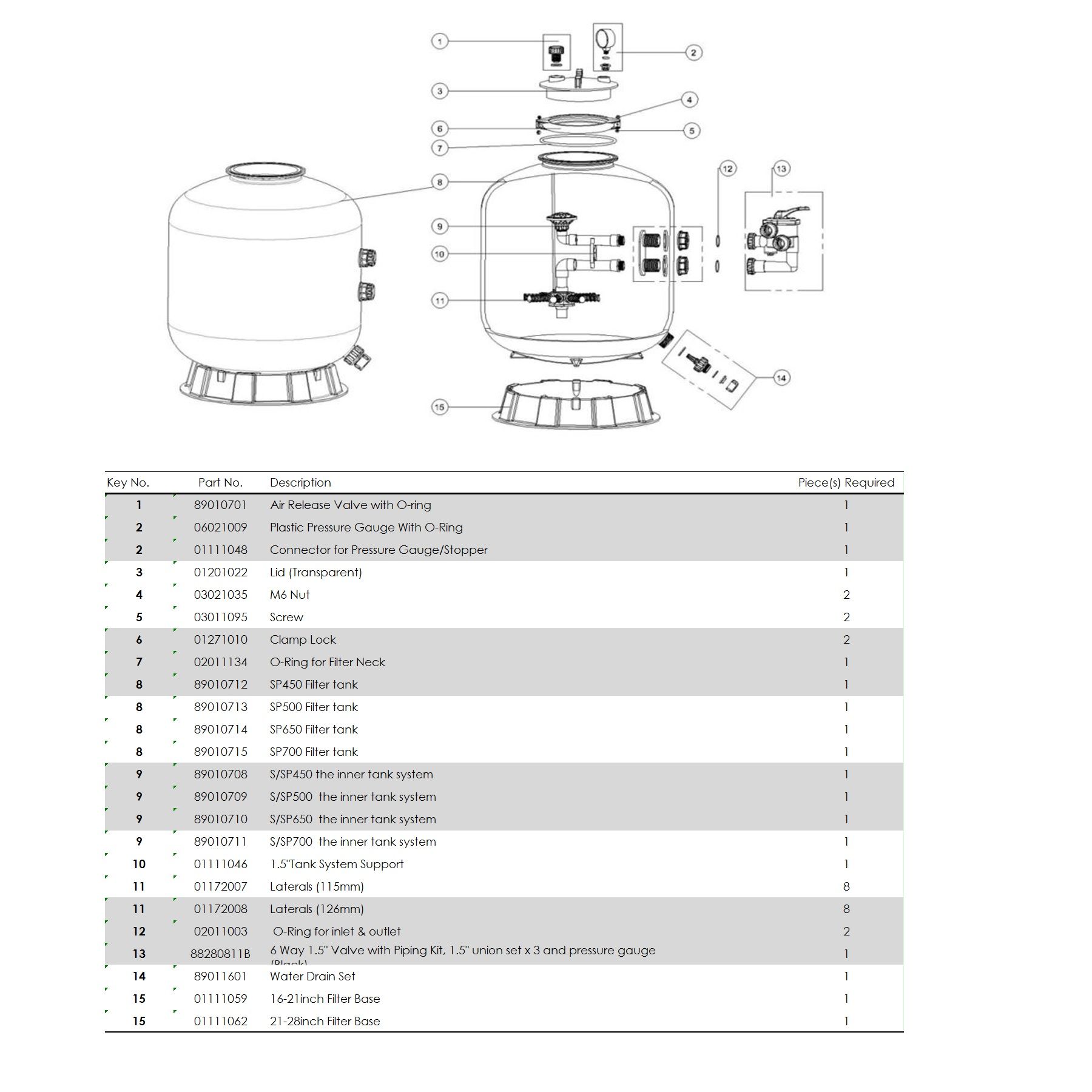 1. Воздушный клапан 2. Манометр для измерения давления внутри емкости 3. Прозрачная крышка 4. Зажимной хомут 5. Уплотнительное кольцо, для герметизации соединения 6. Диффузор фильтра 7. Корпус фильтрационной емкости 8. Сепаратор для забора очищенной воды 9. 6 - ти позиционный клапан с боковым типом подключения 10. Спусковая пробка 11. Основание фильтра